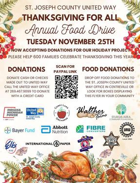 Do you know of someone in St. Joseph County or do you need help with a Thanksgiving dinner? Call the United Way office at 269-467-9099 to sign up for a box of food for the Thanksgiving weekend.